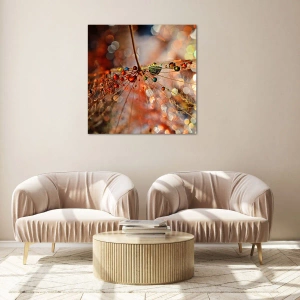La peinture sur verre est faite sur un verre de 4 mm d'épaisseur. Les bords du verre ont une arête trapézoïdale mate. La tableau est sûr à l'utilisation et prêt à être accroché - il a des crochets en métal attachés à l'arrière du cadre et des entretoises en mousse permettant la régulation uniforme de la distance du tableau au mur.
