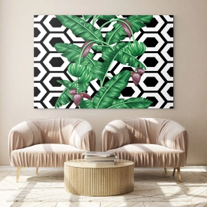 Impression sur verre - Image sur verre - Feuilles et fleurs tropicales sur un fond à motifs géométriques noir et blanc - 50x70cm - Une composition symétrique par nature - Décoration murale moderne pour le salon et la chambre ARTTOR