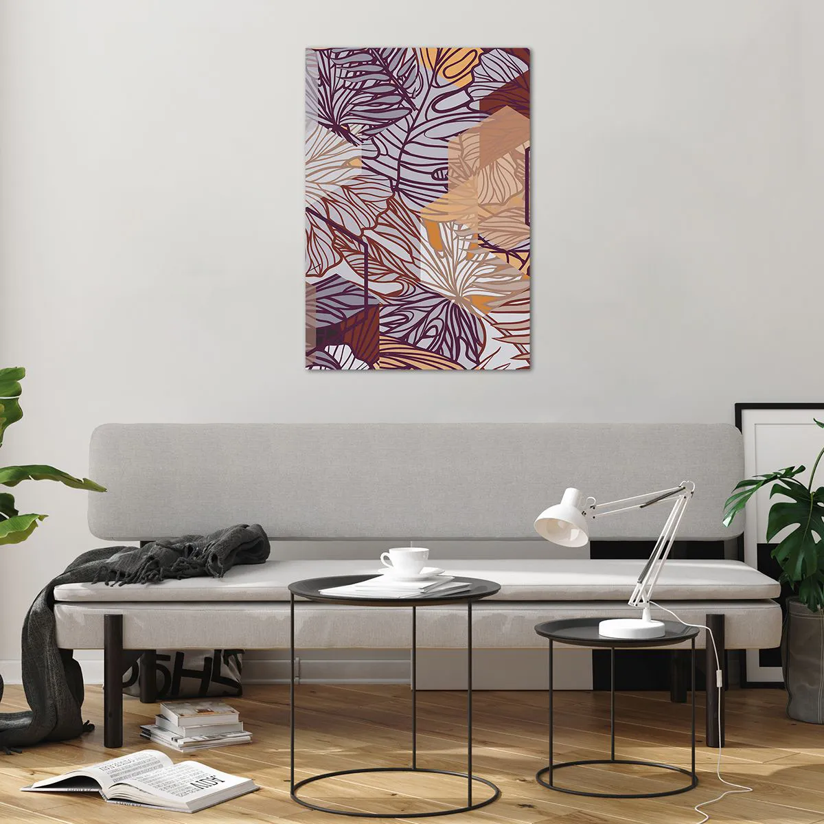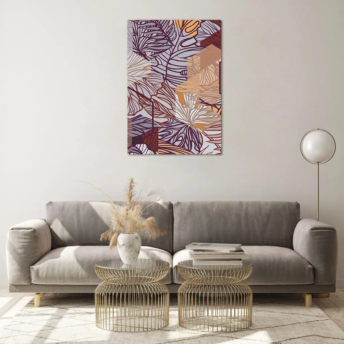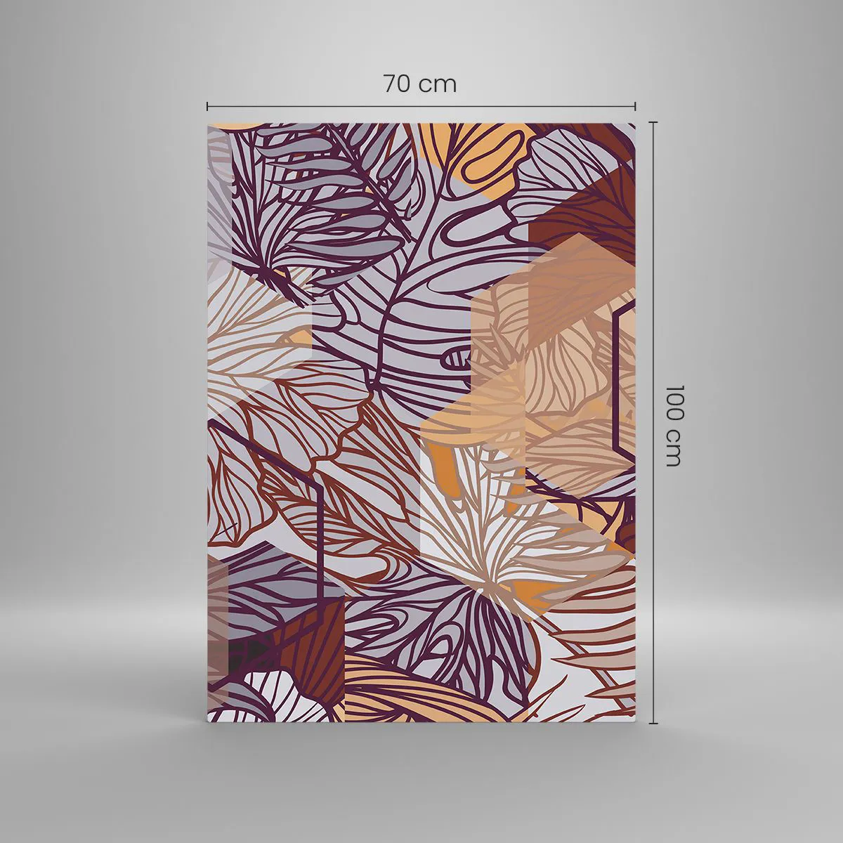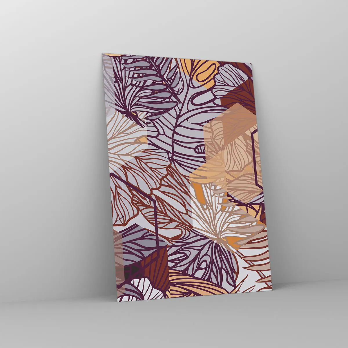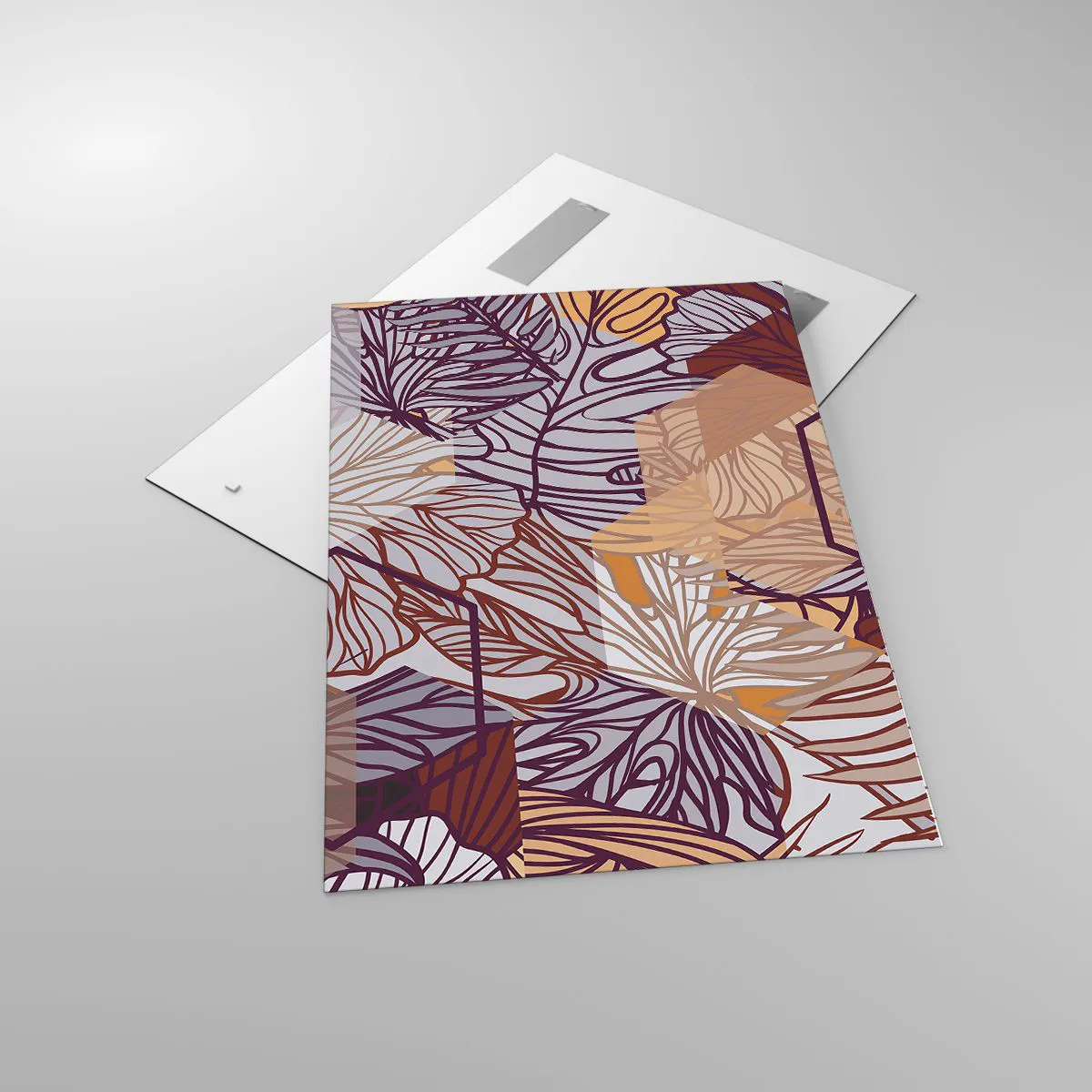 Impression sur verre - Image sur verre - Un motif décoratif de feuilles tropicales dans des tons de violet, d'orange et de beige. - 70x100cm - Relation impossible entre la géométrie et la nature - Décoration murale moderne pour le salon et la chambre ARTT