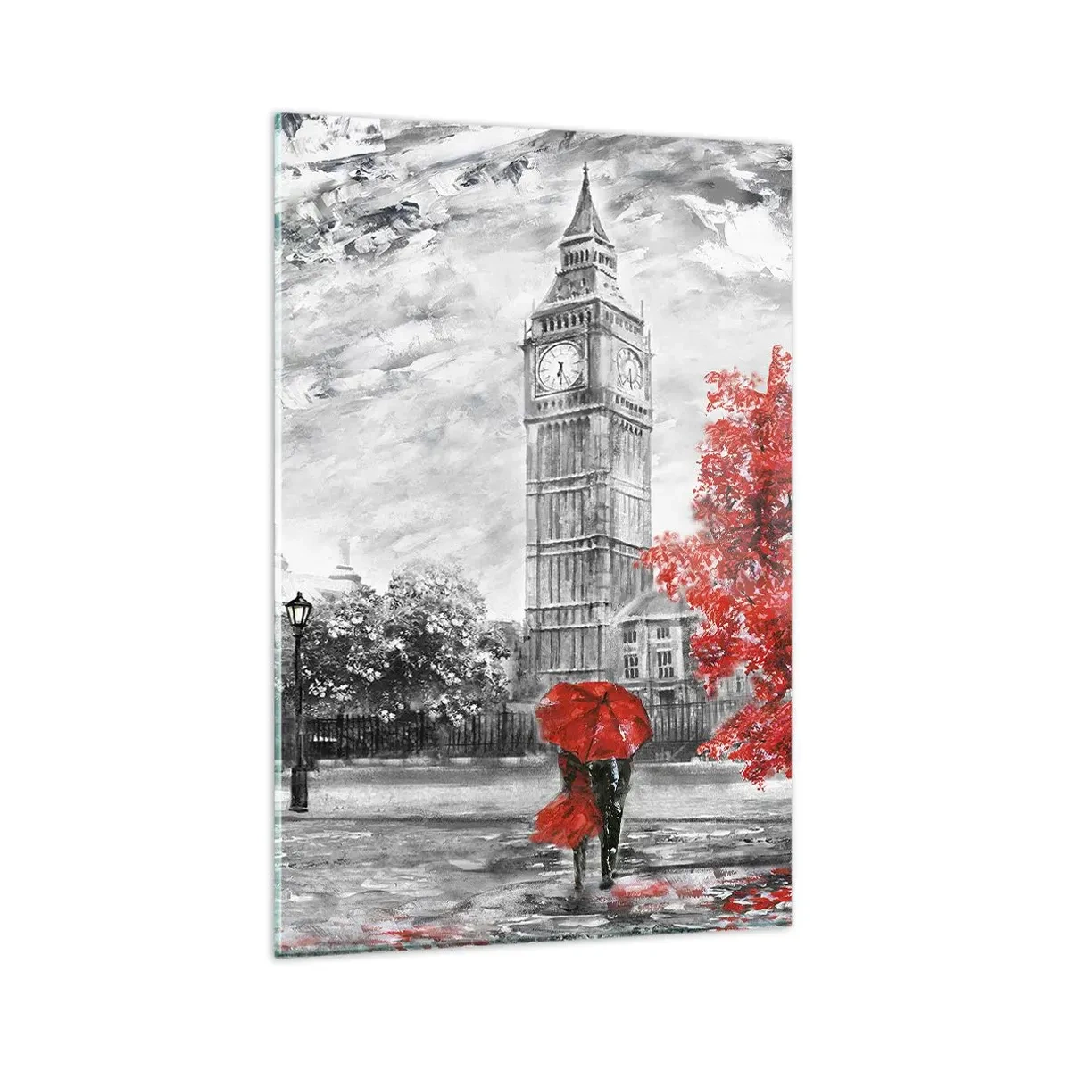 Impression sur verre - Image sur verre - Vue emblématique de Londres avec Big Ben, un bus rouge et un parapluie - 80x120cm - Une journée passionnante - Décoration murale moderne pour le salon et la chambre ARTTOR