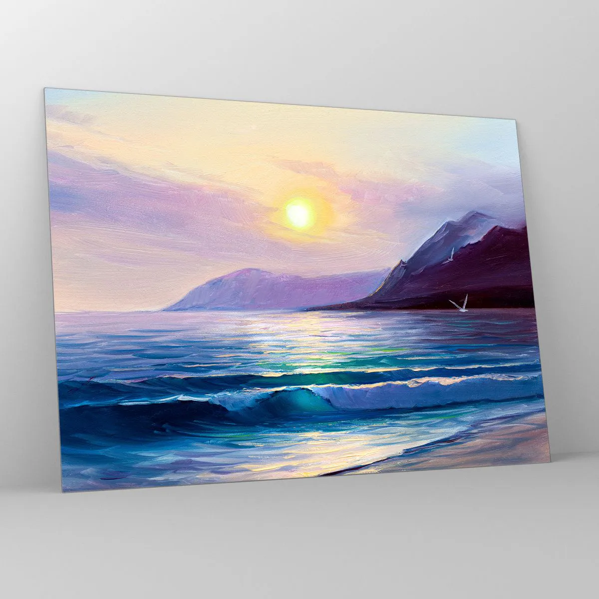- Une peinture sur verre représentant un coucher de soleil pittoresque sur une mer calme et des montagnes. Un motif romantique et relaxant pour les amoureux de la nature.