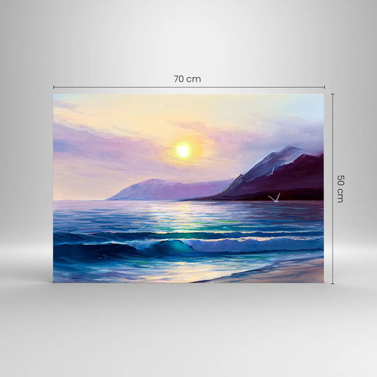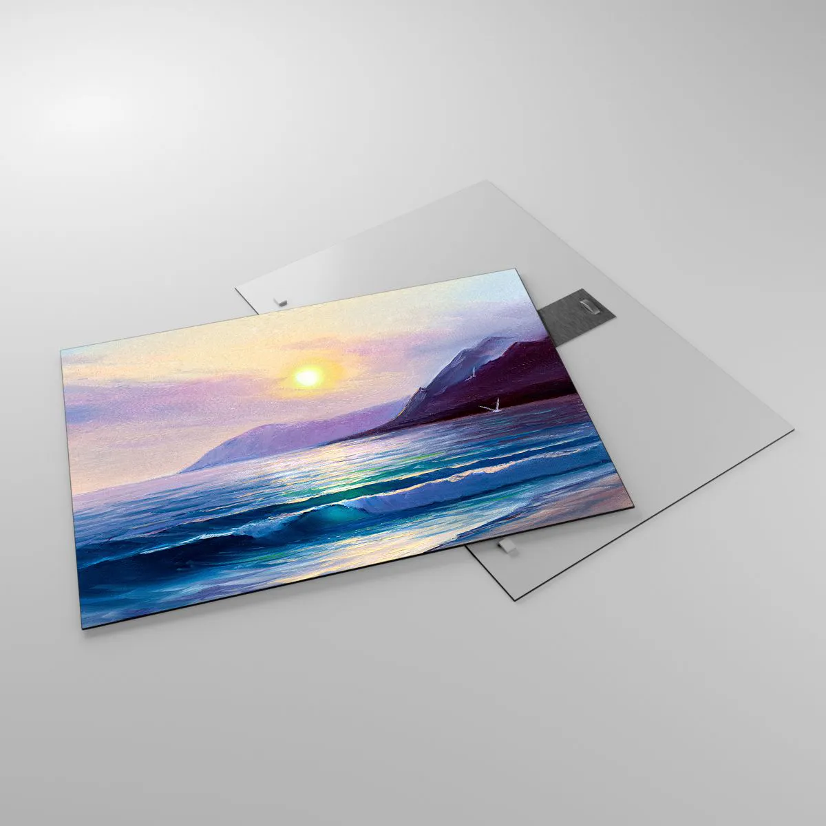 Tableau sur verre représentant un coucher de soleil pittoresque sur une mer calme et des montagnes. Un motif romantique et relaxant pour les amoureux de la nature.