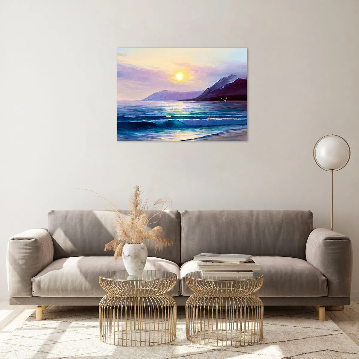 Ce motif artistique allie la beauté de la nature à l'harmonie et à la paix, créant une décoration inspirante et relaxante. Les nuances chaudes du soleil couchant et les couleurs subtiles de l'eau confèrent à cette composition un charme unique.