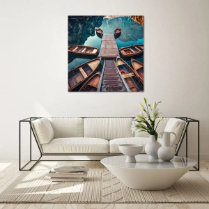 Impression sur verre - Image sur verre - Vue de bateaux en bois amarrés à un quai dans les montagnes - 70x50cm - J'attends à la marina - Décoration murale moderne pour le salon et la chambre ARTTOR