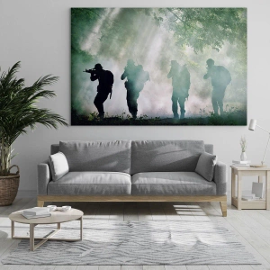 Impression sur verre - Image sur verre - Un groupe de soldats en fumée, marchant dans la forêt, en état d'alerte maximale - 70x50cm - Un pour tous… - Décoration murale moderne pour le salon et la chambre ARTTOR