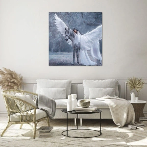 Impression sur verre - Image sur verre - Pégase aux ailes blanches et une femme en robe dans une forêt mystique - 120x80cm - Un moment inspiré - Décoration murale moderne pour le salon et la chambre ARTTOR