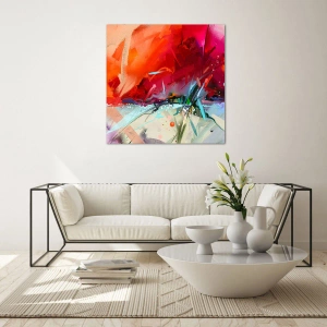 La peinture sur verre est faite sur un verre de 4 mm d'épaisseur. Les bords du verre ont une arête trapézoïdale mate. La tableau est sûr à l'utilisation et prêt à être accroché - il a des crochets en métal attachés à l'arrière du cadre et des entretoises en mousse permettant la régulation uniforme de la distance du tableau au mur.
