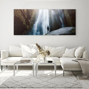 Impression sur verre - Image sur verre - Un homme debout sur un rocher devant une puissante cascade au soleil - 100x70cm - Restauration des proportions - Décoration murale moderne pour le salon et la chambre ARTTOR