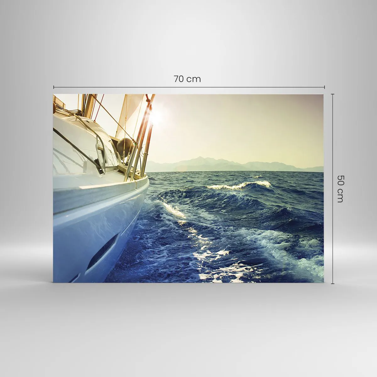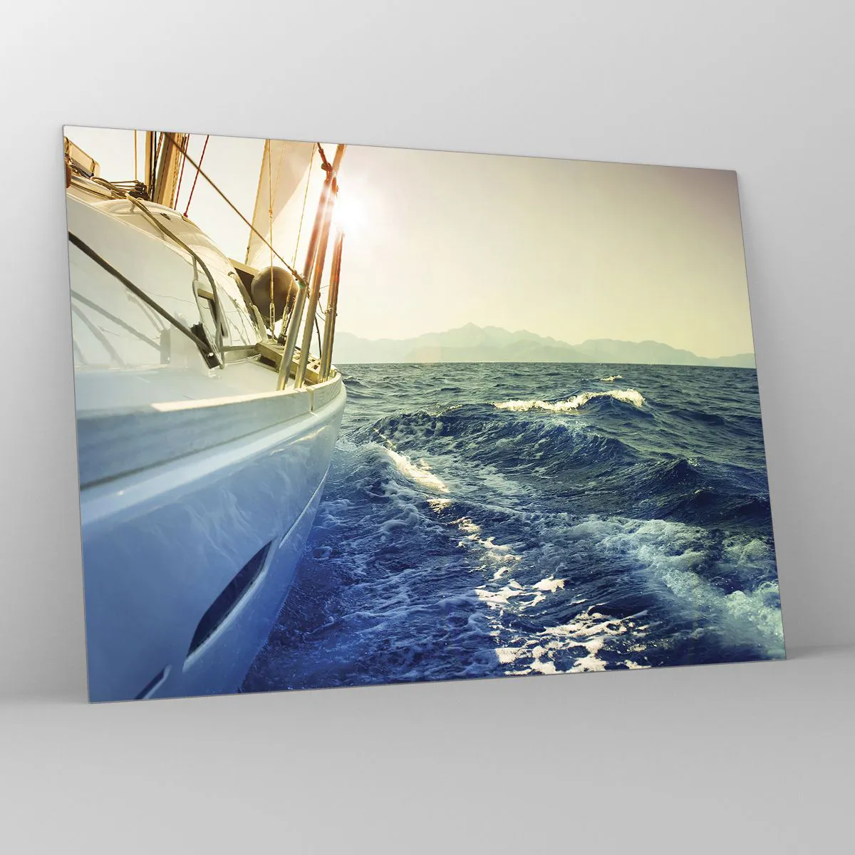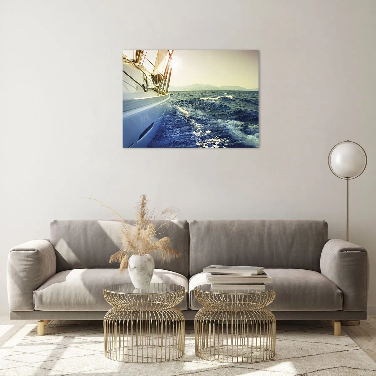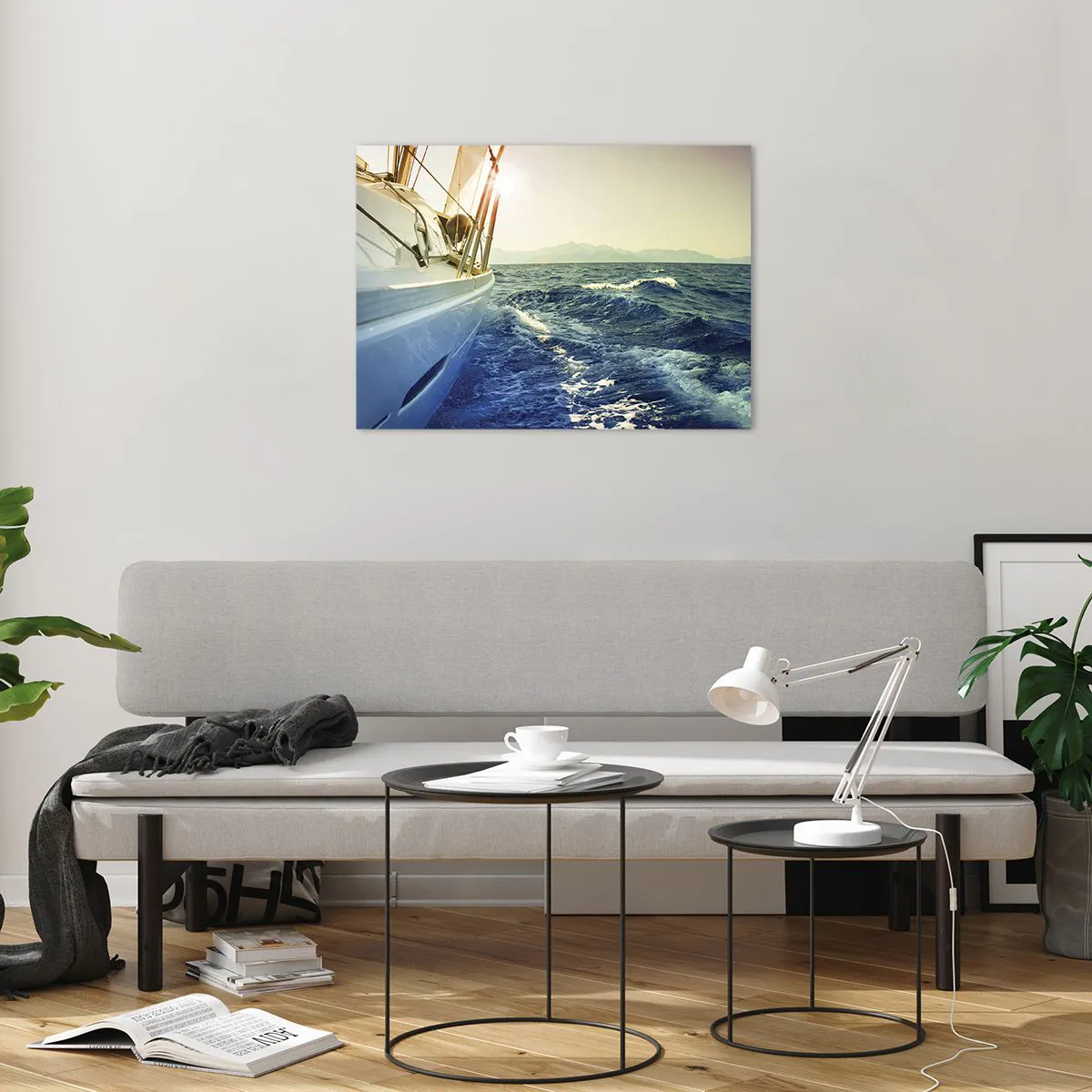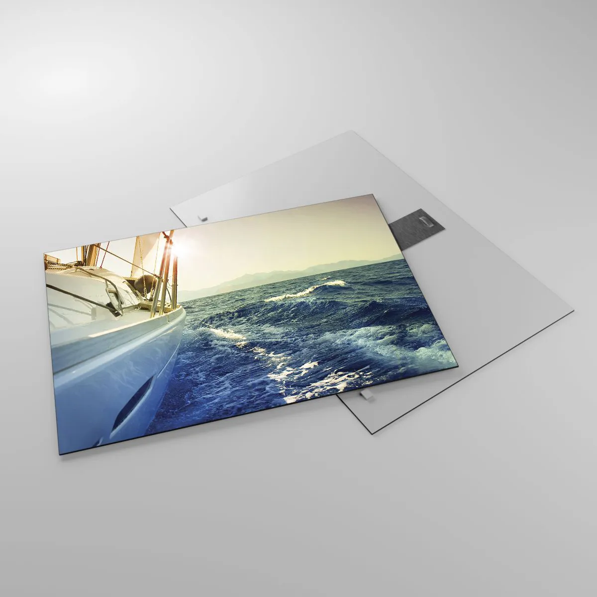 Impression sur verre - Image sur verre - Un voilier sur une mer calme à la lumière du soleil couchant - 70x50cm - Suite à l'aventure - Décoration murale moderne pour le salon et la chambre ARTTOR