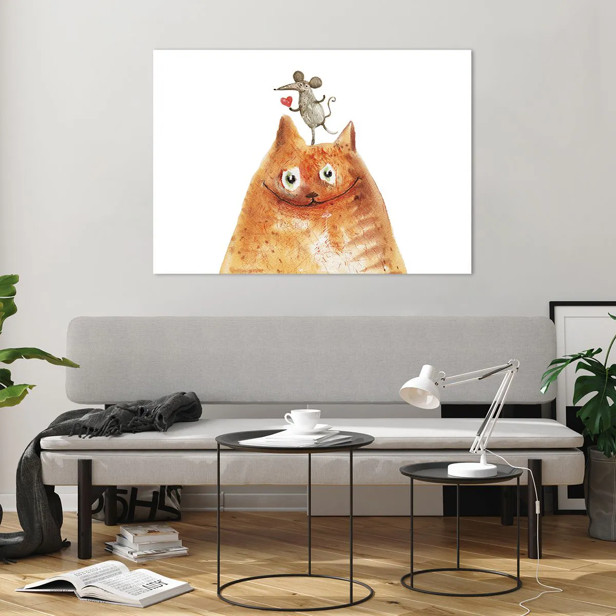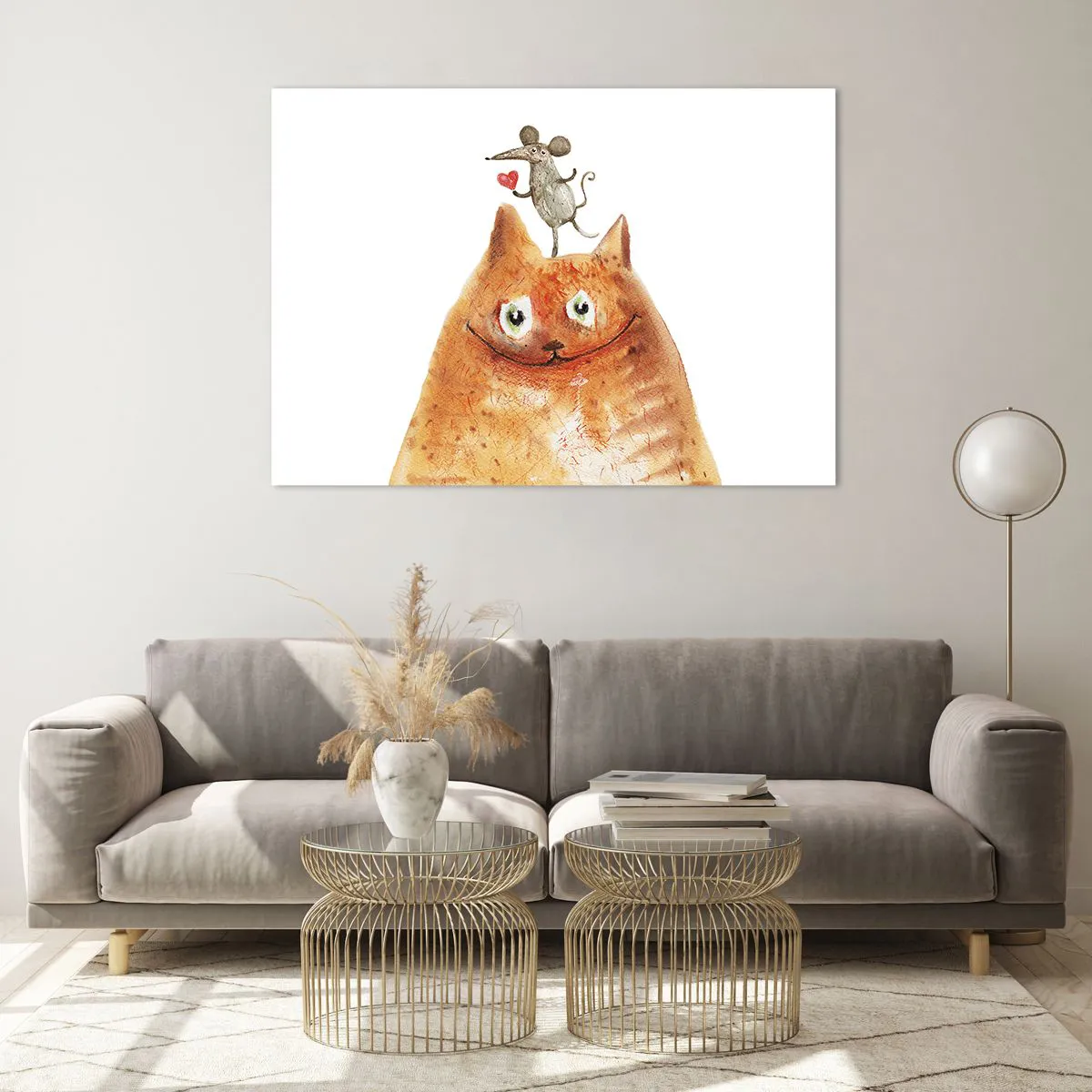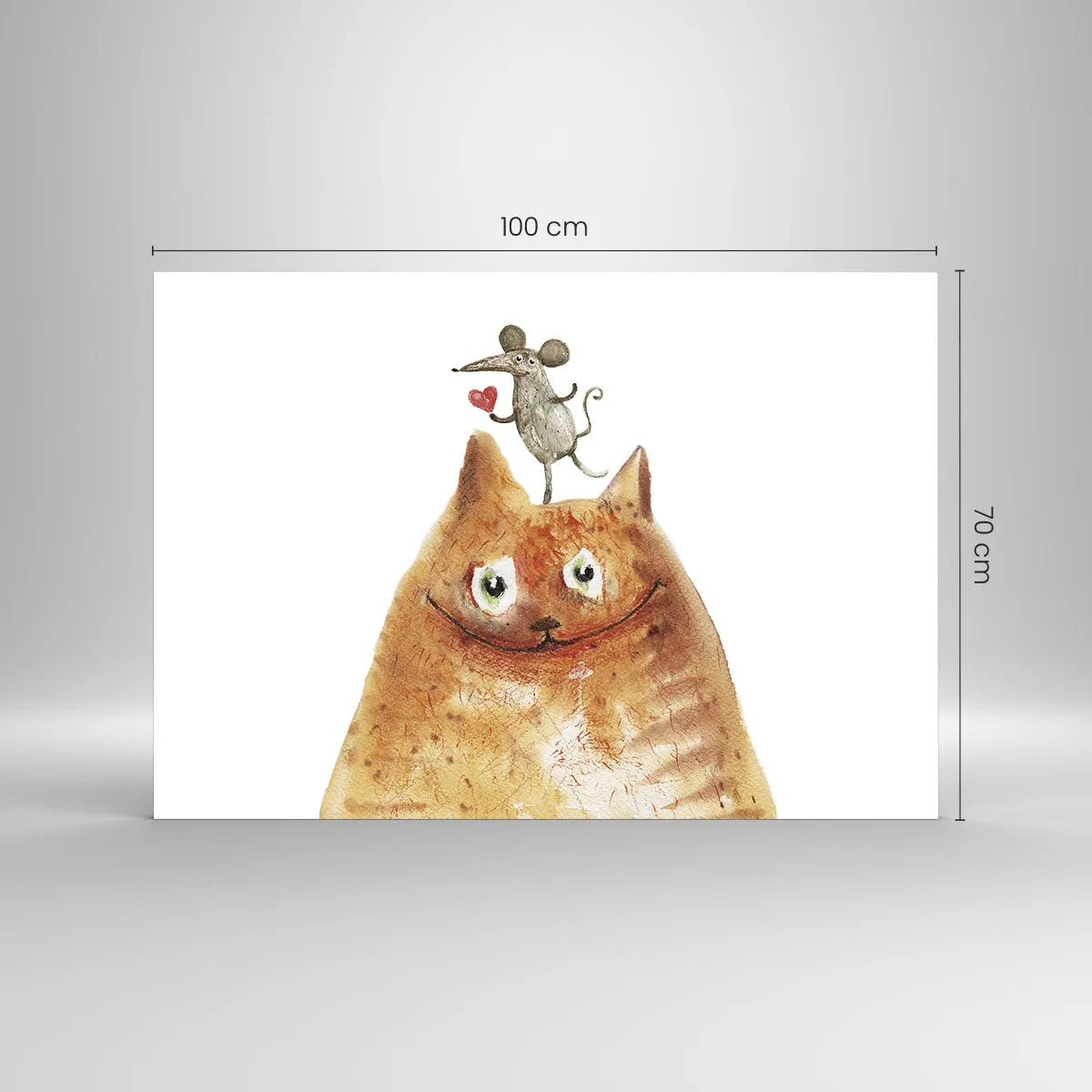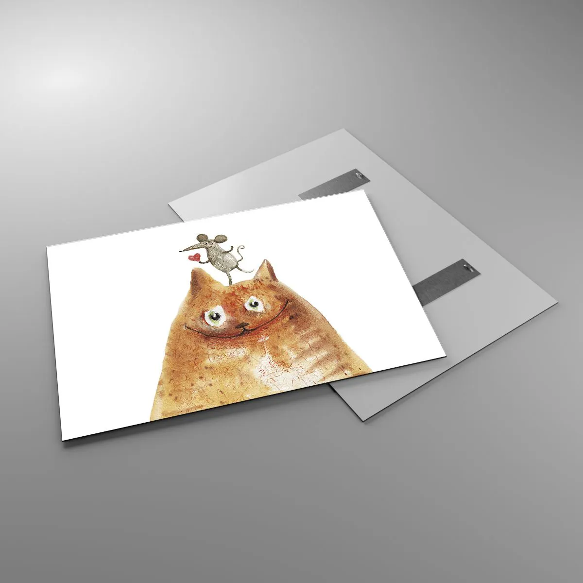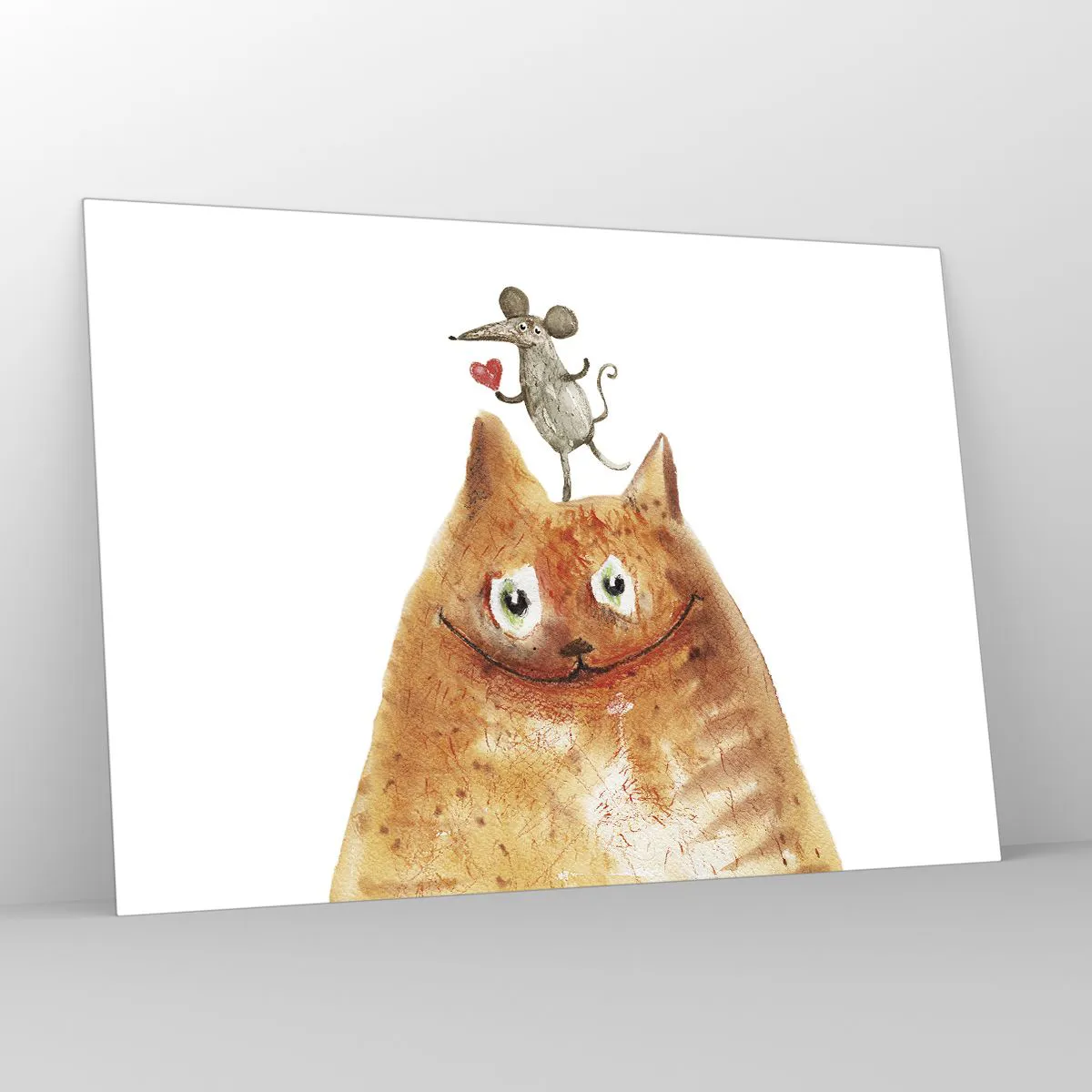 Impression sur verre - Image sur verre - Un chat avec une souris sur la tête dans un style humoristique - 100x70cm - Amour paradoxal - Décoration murale moderne pour le salon et la chambre ARTTOR