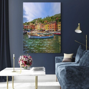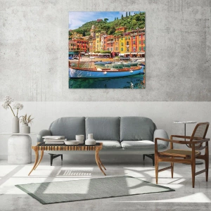 Impression sur verre - Image sur verre - Bâtiments colorés près du port dans une ville pittoresque - 70x50cm - Matinée italienne - Décoration murale moderne pour le salon et la chambre ARTTOR