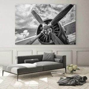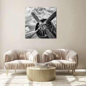 « Conquérant du Ciel » est une peinture sur verre qui attire l'attention par son sujet unique et son élégance. Elle représente un gros plan d'une hélice d'avion, présenté dans des tons noir et blanc, conférant à la composition un caractère rétro. Les détails mécaniques sont parfaitement visibles, soulignant le style industriel et conférant au tableau une expression unique.