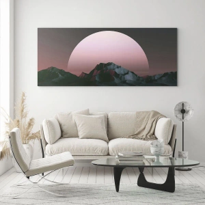 - Ce tableau représente un paysage abstrait avec des montagnes géométriques et un soleil rose pastel sur un fond sombre. Il est idéal pour les intérieurs modernes.