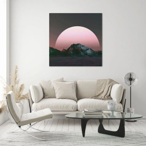 Impression sur verre - Image sur verre - Paysage abstrait avec des montagnes géométriques et un soleil rose. - 70x50cm - Dans une galaxie voisine - Décoration murale moderne pour le salon et la chambre ARTTOR