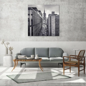 La peinture sur verre est faite sur un verre de 4 mm d'épaisseur. Les bords du verre ont une arête trapézoïdale mate. La tableau est sûr à l'utilisation et prêt à être accroché - il a des crochets en métal attachés à l'arrière du cadre et des entretoises en mousse permettant la régulation uniforme de la distance du tableau au mur.