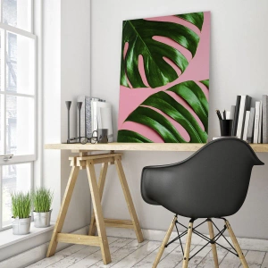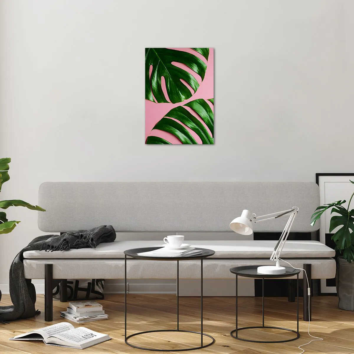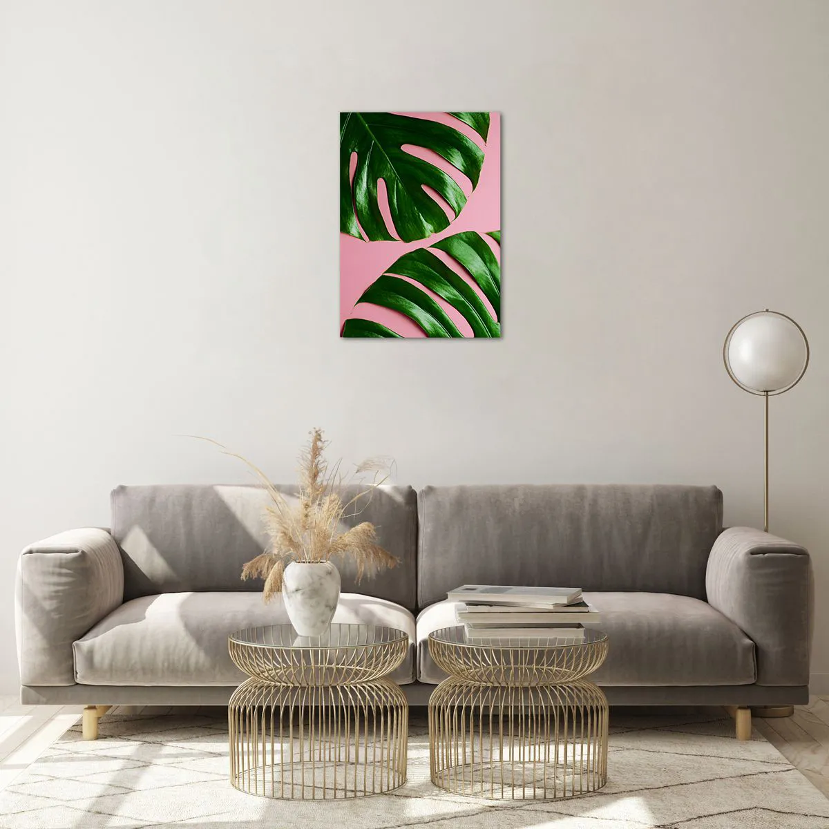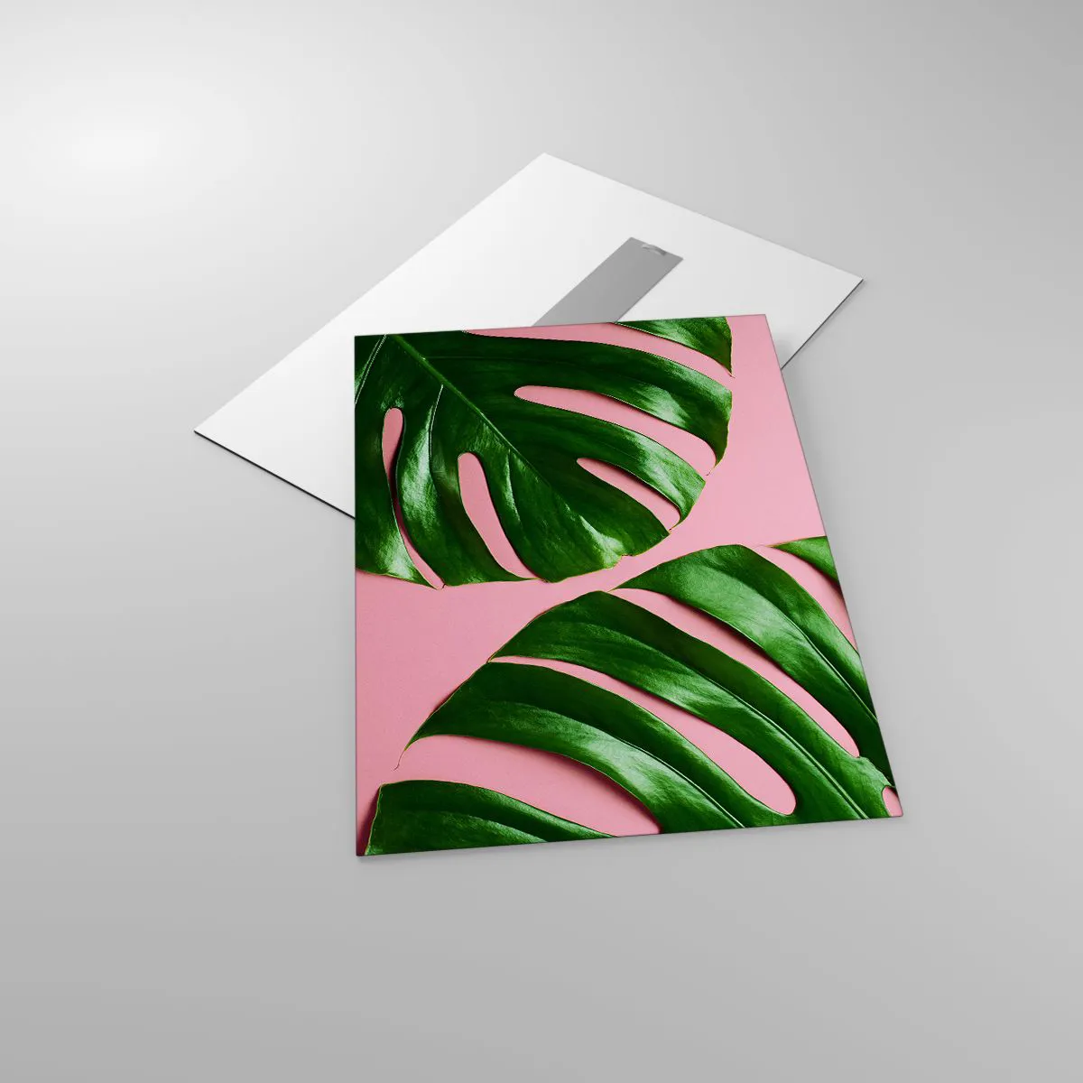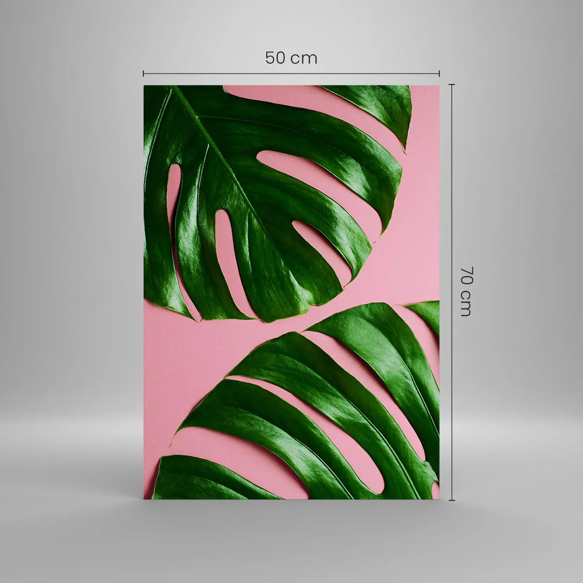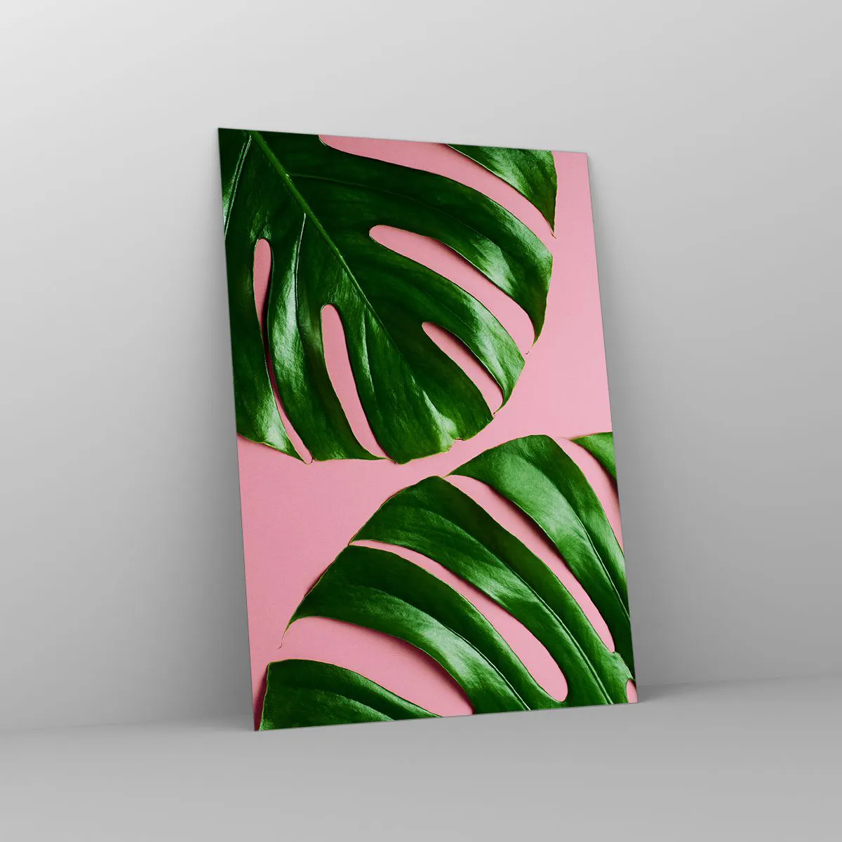 Impression sur verre - Image sur verre - Feuilles de monstera vertes sur fond rose - 50x70cm - Rendez-vous vert - Décoration murale moderne pour le salon et la chambre ARTTOR