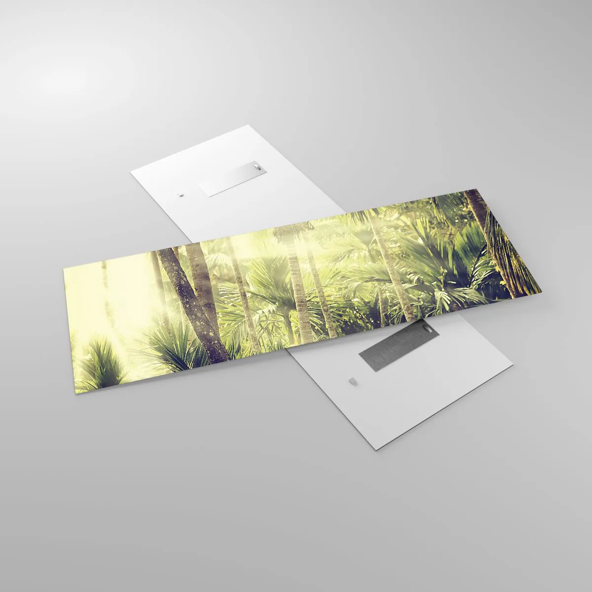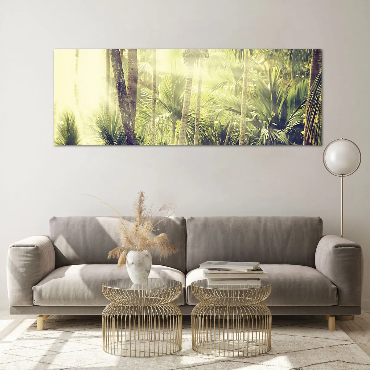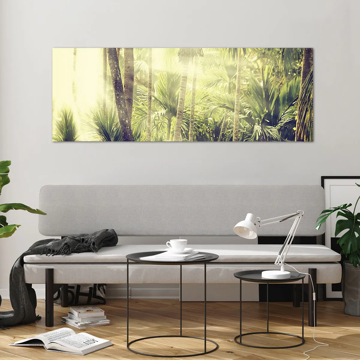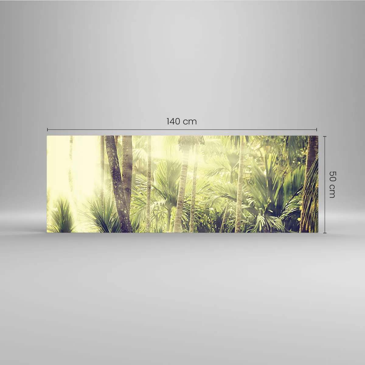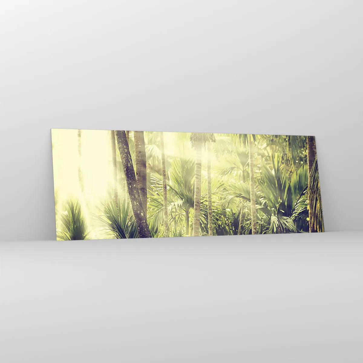 Impression sur verre - Image sur verre - Rayons de soleil dans une forêt tropicale de palmiers - 140x50cm - Nature enflammée - Décoration murale moderne pour le salon et la chambre ARTTOR