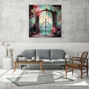 Impression sur verre - Image sur verre - Une entrée magique avec un portail en fer forgé entouré d'une végétation mystérieuse - 80x120cm - Jardin secret - Décoration murale moderne pour le salon et la chambre ARTTOR