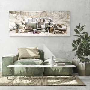 Impression sur verre - Image sur verre - Un intérieur de camping-car dans un décor désertique, avec des éléments bohèmes et naturels. - 120x80cm - Il est temps de commencer le voyage - Décoration murale moderne pour le salon et la chambre ARTTOR