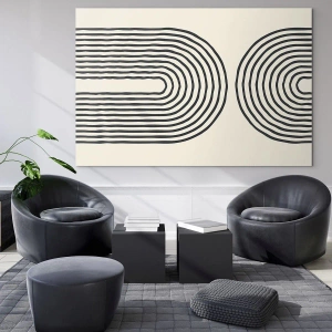 - Peinture abstraite en noir et blanc avec des lignes géométriques en forme d'arcs.