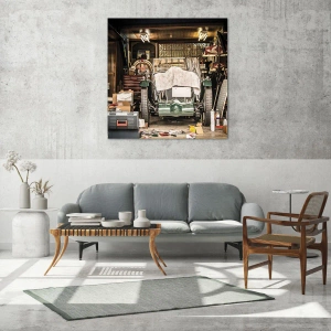 Impression sur verre - Image sur verre - Garage vintage avec une voiture recouverte d'un tissu, entourée d'outils et de boîtes - 100x70cm - Retour vers le passé - Décoration murale moderne pour le salon et la chambre ARTTOR