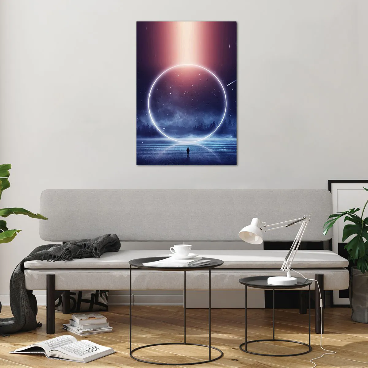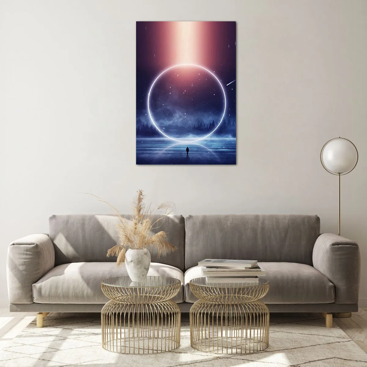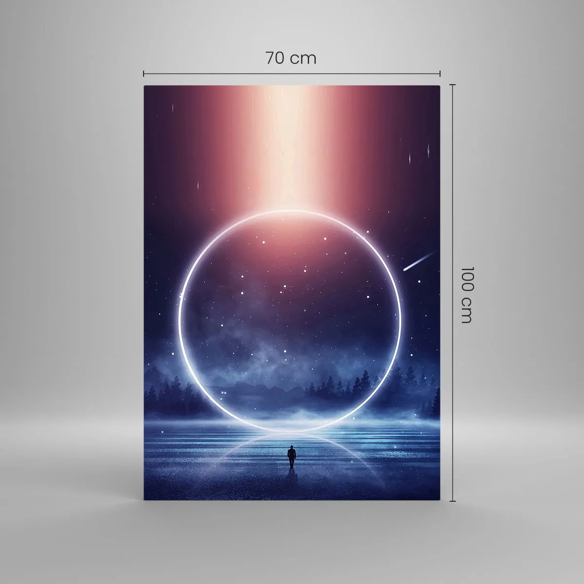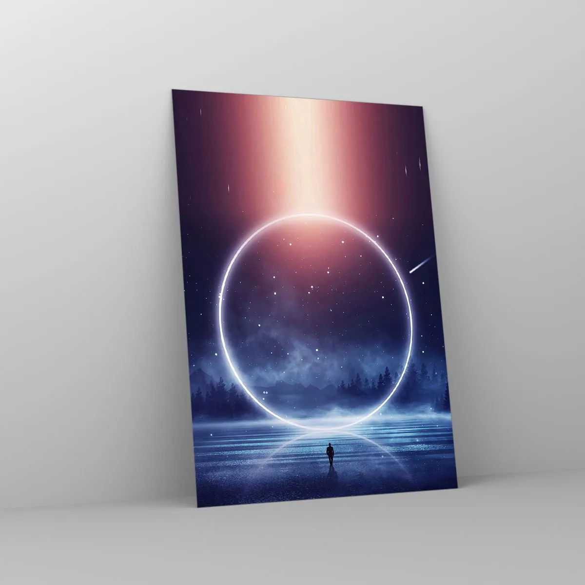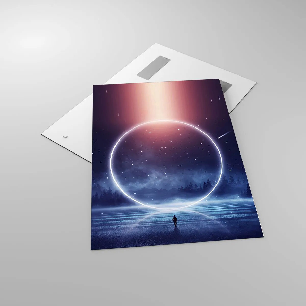 Impression sur verre - Image sur verre - Un paysage magique avec une silhouette et un cercle de lumière la nuit - 70x100cm - Ils sont déjà là... - Décoration murale moderne pour le salon et la chambre ARTTOR