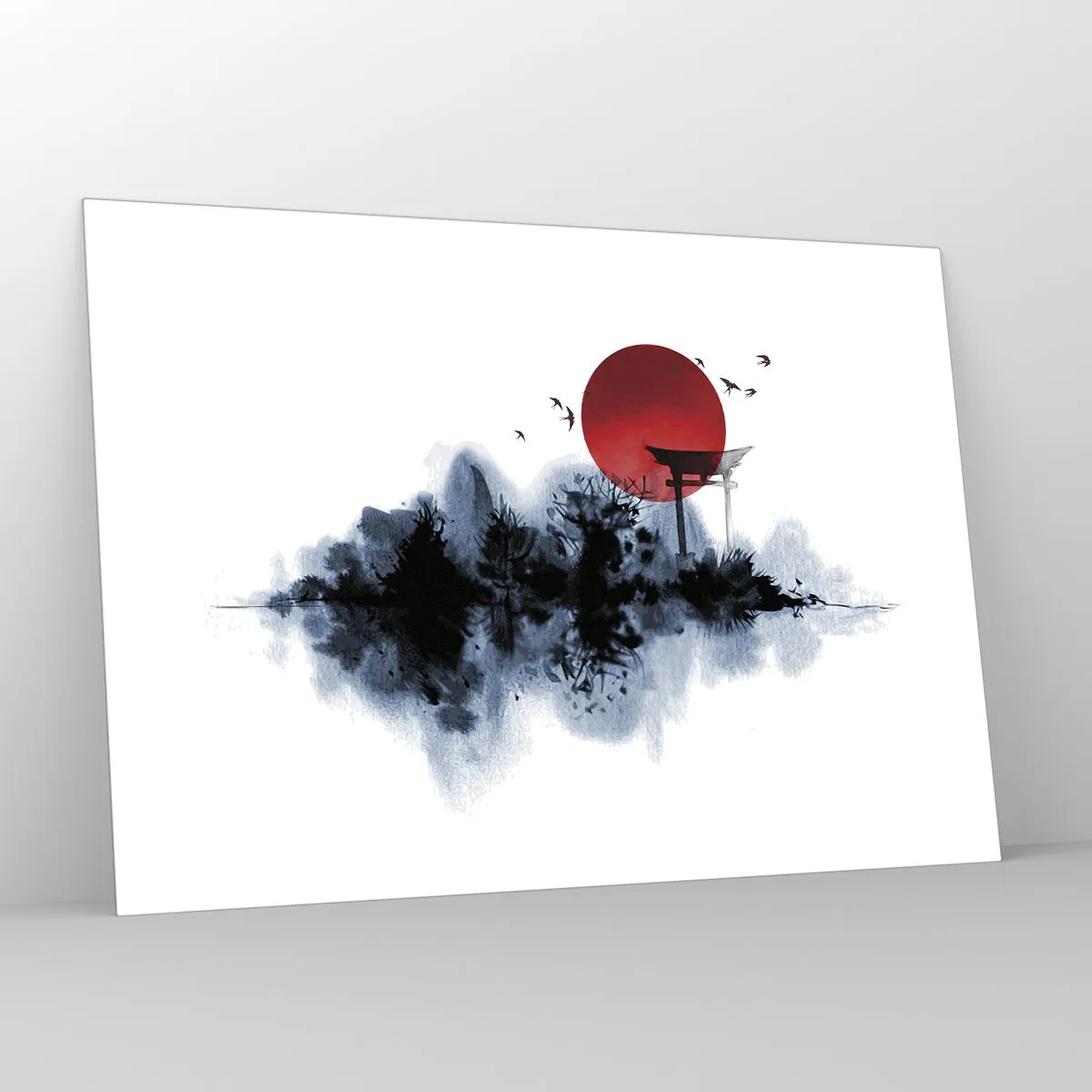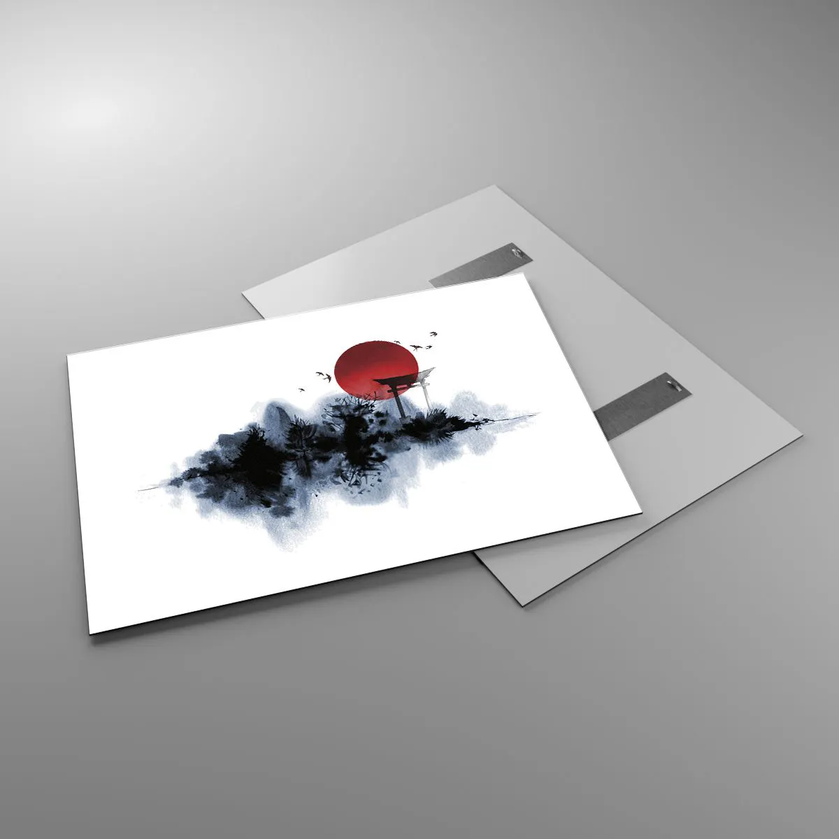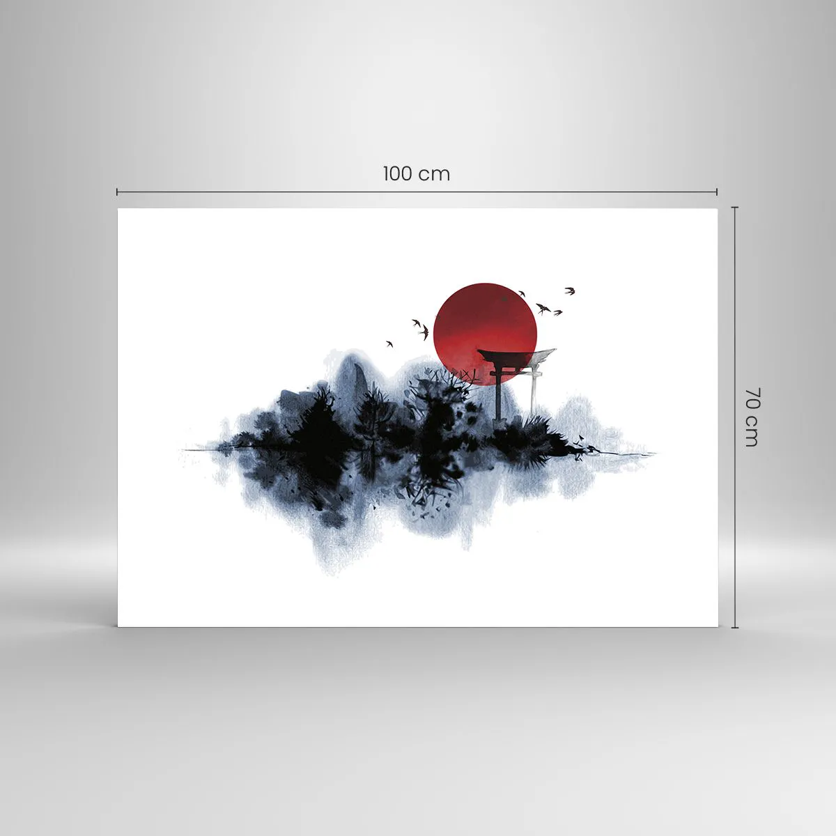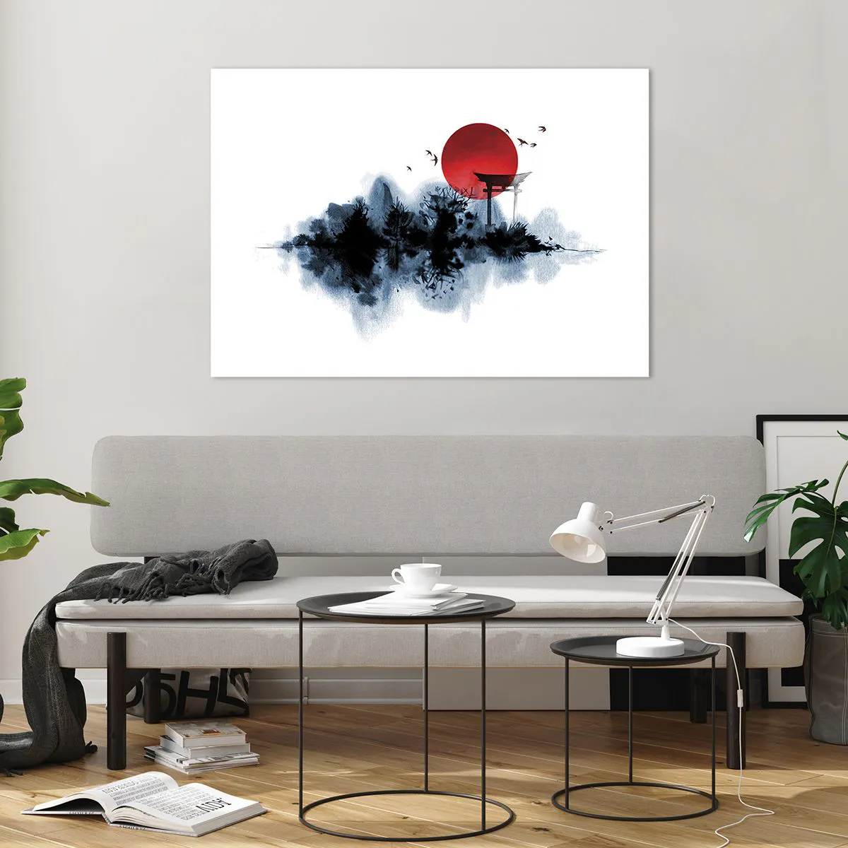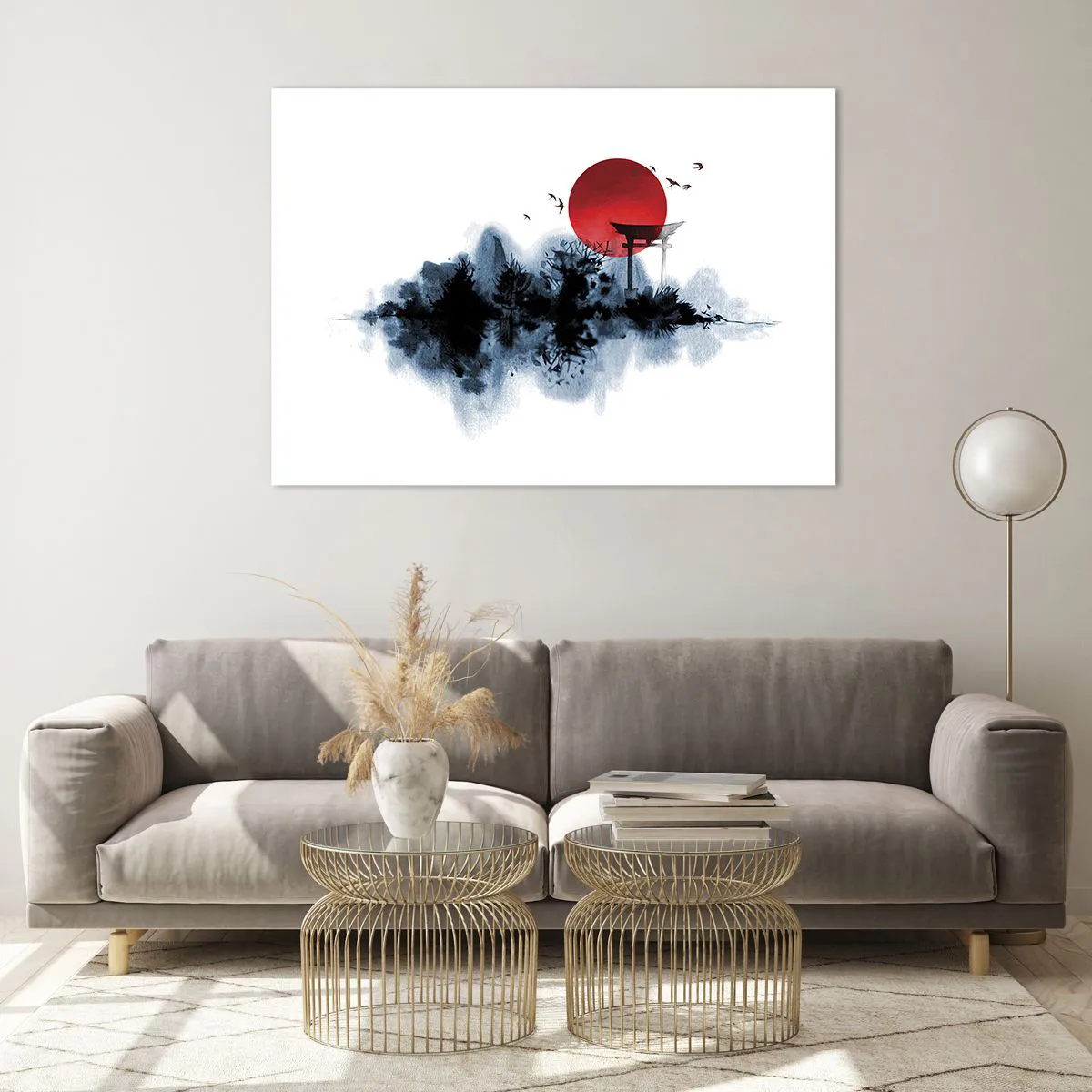 Impression sur verre - Image sur verre - Un paysage minimaliste avec un torii et un soleil rouge. - 100x70cm - Vue japonnaise - Décoration murale moderne pour le salon et la chambre ARTTOR