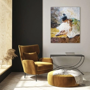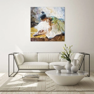 Le ballet, synonyme de discipline, de grâce et de beauté, est capturé dans ce tableau dans l'un de ses moments les plus intimes : un moment de préparation, de concentration ou de détente. Cela fait de cette œuvre non seulement une pièce décorative, mais aussi un portrait émotionnel de l'engagement et de la passion humaine. La subtilité touchante de la scène capturée interpelle le spectateur sur le plan émotionnel, rendant le tableau particulièrement pertinent.