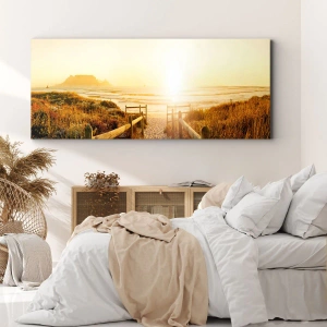 Impression sur toile - Image sur toile - Chemin vers la plage pendant un coucher de soleil doré - 100x70cm - A travers la dune, vers le soleil - Décoration murale moderne pour le salon et la chambre ARTTOR