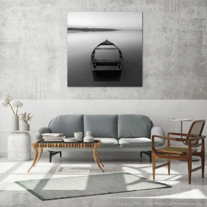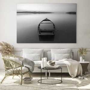 Impression sur verre - Image sur verre - Un vieux bateau sur une surface d'eau calme en noir et blanc - 120x80cm - Nostalgie et mélancolie - Décoration murale moderne pour le salon et la chambre ARTTOR