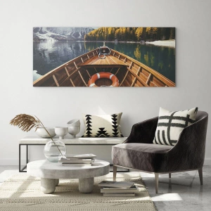 - Une photo prise depuis un bateau en bois flottant sur un lac cristallin entouré de montagnes et d'une forêt automnale. Une décoration idéale pour les intérieurs inspirés par la nature et la tranquillité des paysages.