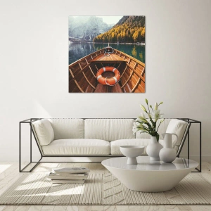 Impression sur verre - Image sur verre - Vue depuis un bateau en bois sur un lac de montagne et une forêt d'automne - 70x50cm - Escapade en montagne - Décoration murale moderne pour le salon et la chambre ARTTOR