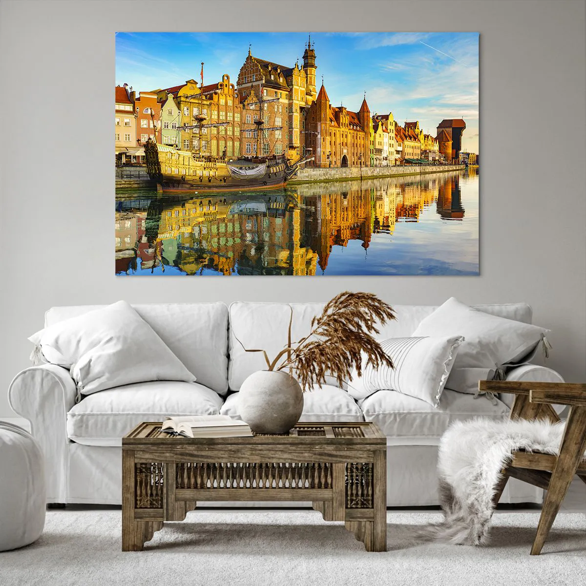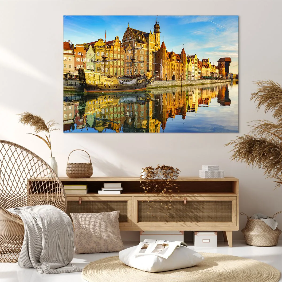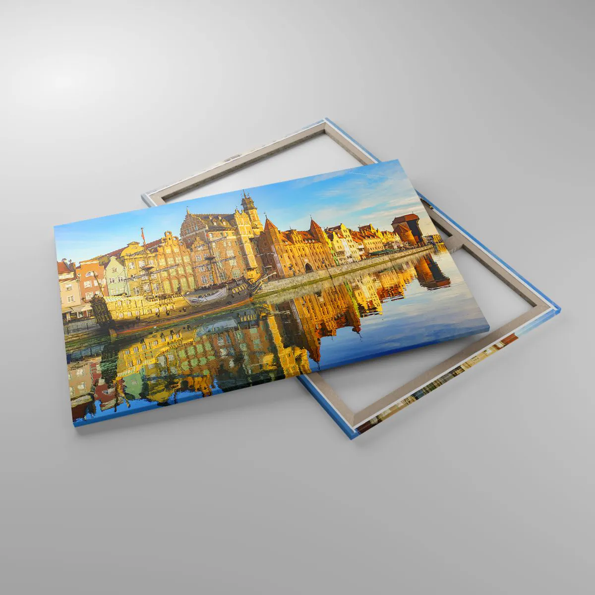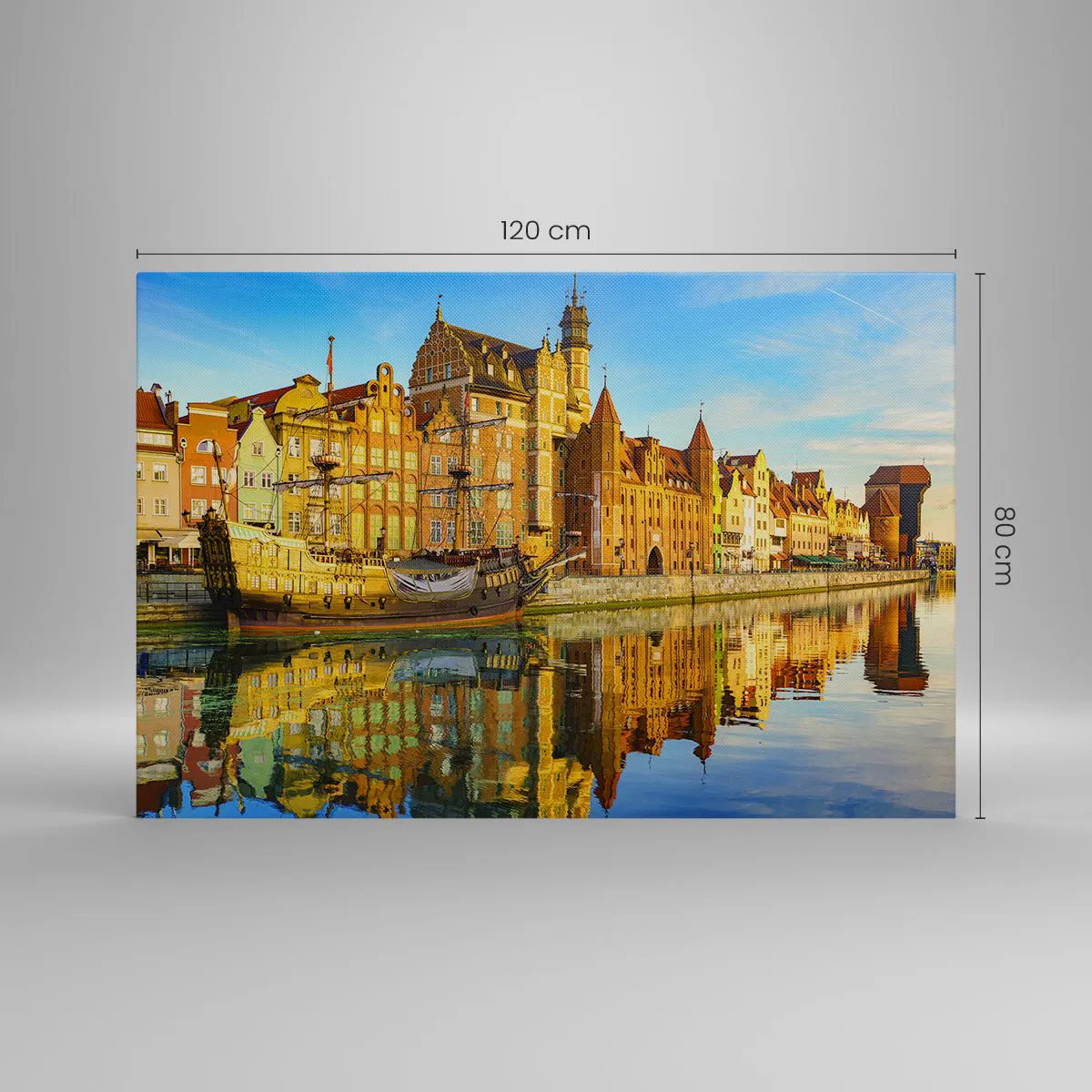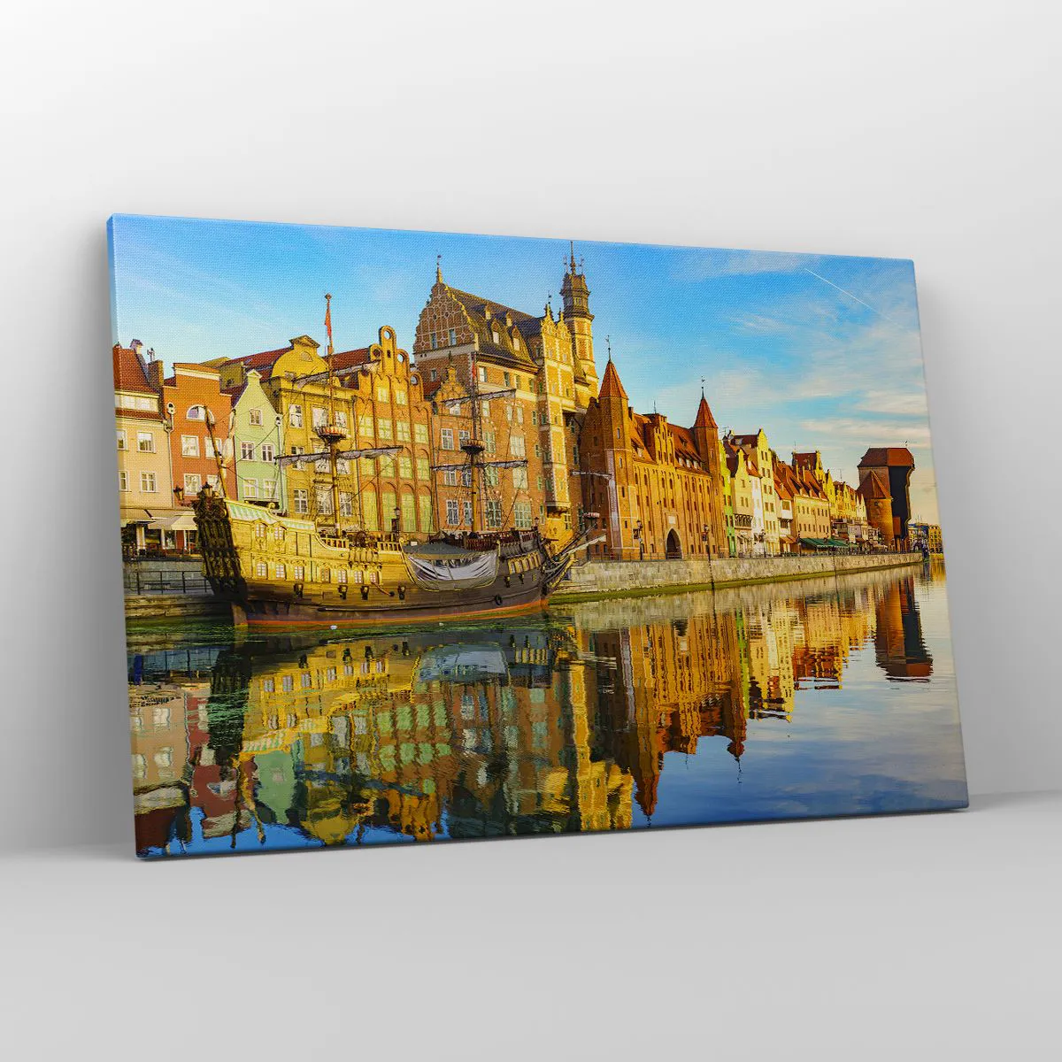 Impression sur toile - Image sur toile - Une vue pittoresque de la vieille ville avec un voilier et de l'eau - 120x80cm - Reflet dans le miroir du passé - Décoration murale moderne pour le salon et la chambre ARTTOR