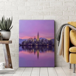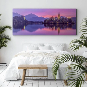 Impression sur toile - Image sur toile - Lac avec une île et une église au coucher du soleil - 120x50cm - Une île de conte de fées au crépuscule - Décoration murale moderne pour le salon et la chambre ARTTOR
