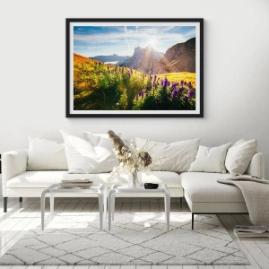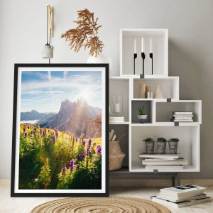 - L'affiche représente un paysage de montagne pittoresque avec une prairie fleurie illuminée par le soleil levant. Cette vue harmonieuse s'intégrera parfaitement à tout intérieur.