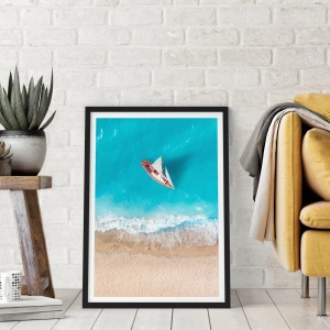 - Une affiche représentant un yacht naviguant sur une mer bleue, juste à côté de la plage. Un paysage magnifique et paisible, baigné de soleil et de liberté.