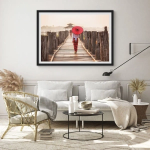 Affiche dans un cadre noir - Poster - Une femme avec un parapluie rouge sur un pont en bois - 100x70cm - Sur le vieux pont - Décoration murale moderne pour le salon et la chambre ARTTOR