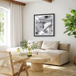 L'affiche « Paradoxes de l'espace » est une décoration murale extraordinaire qui apporte une touche de surréalisme et d'illusion artistique à votre intérieur. L'image représente un labyrinthe d'escaliers et de couloirs, créant un puzzle visuel stimulant l'imagination. La dominante noir et blanc souligne la forme géométrique et confère à l'ensemble un caractère minimaliste.