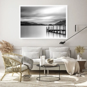Affiche - Poster - Scène en noir et blanc avec un lac, une jetée et des montagnes - 50x70cm - Douceur et force - Décoration murale moderne pour le salon et la chambre ARTTOR