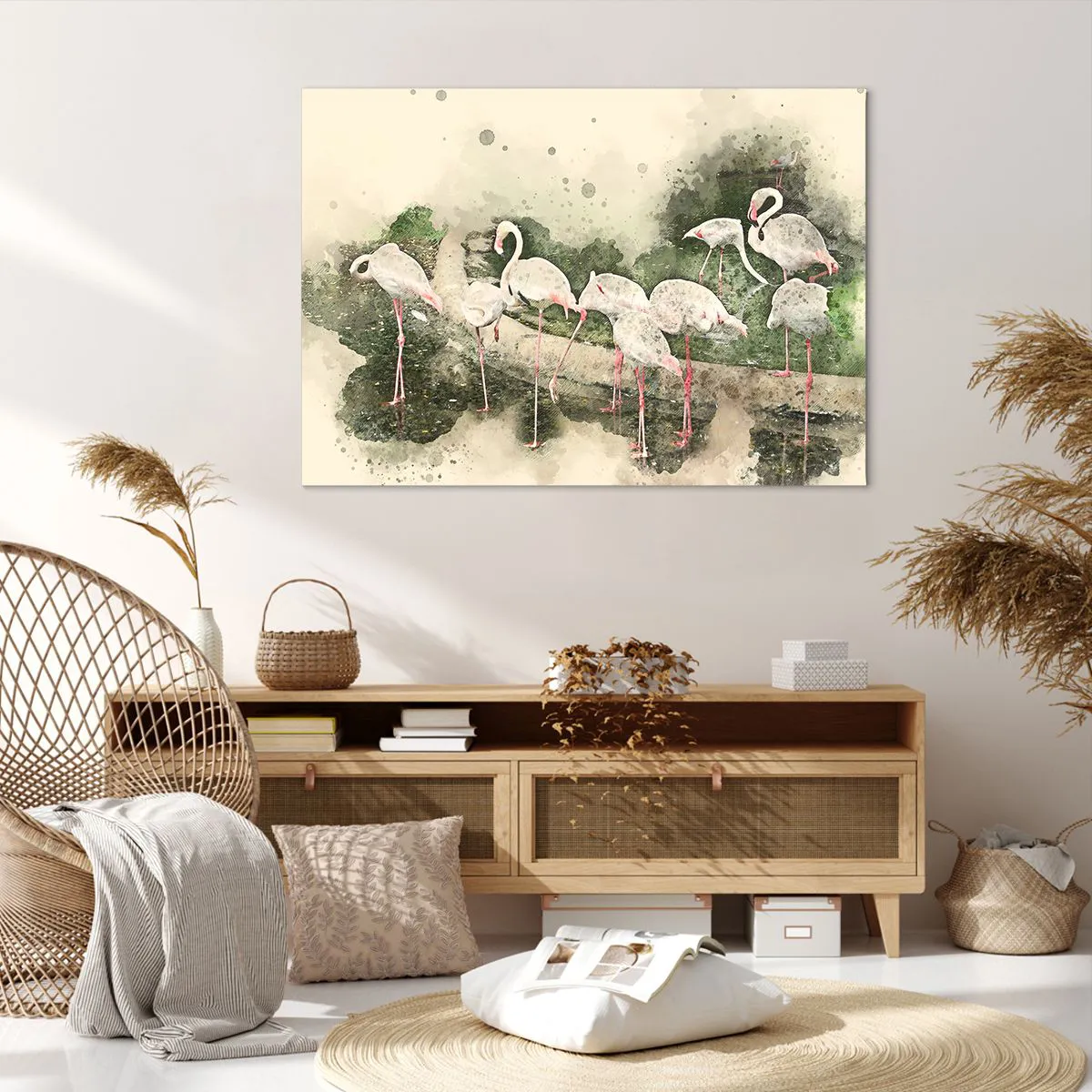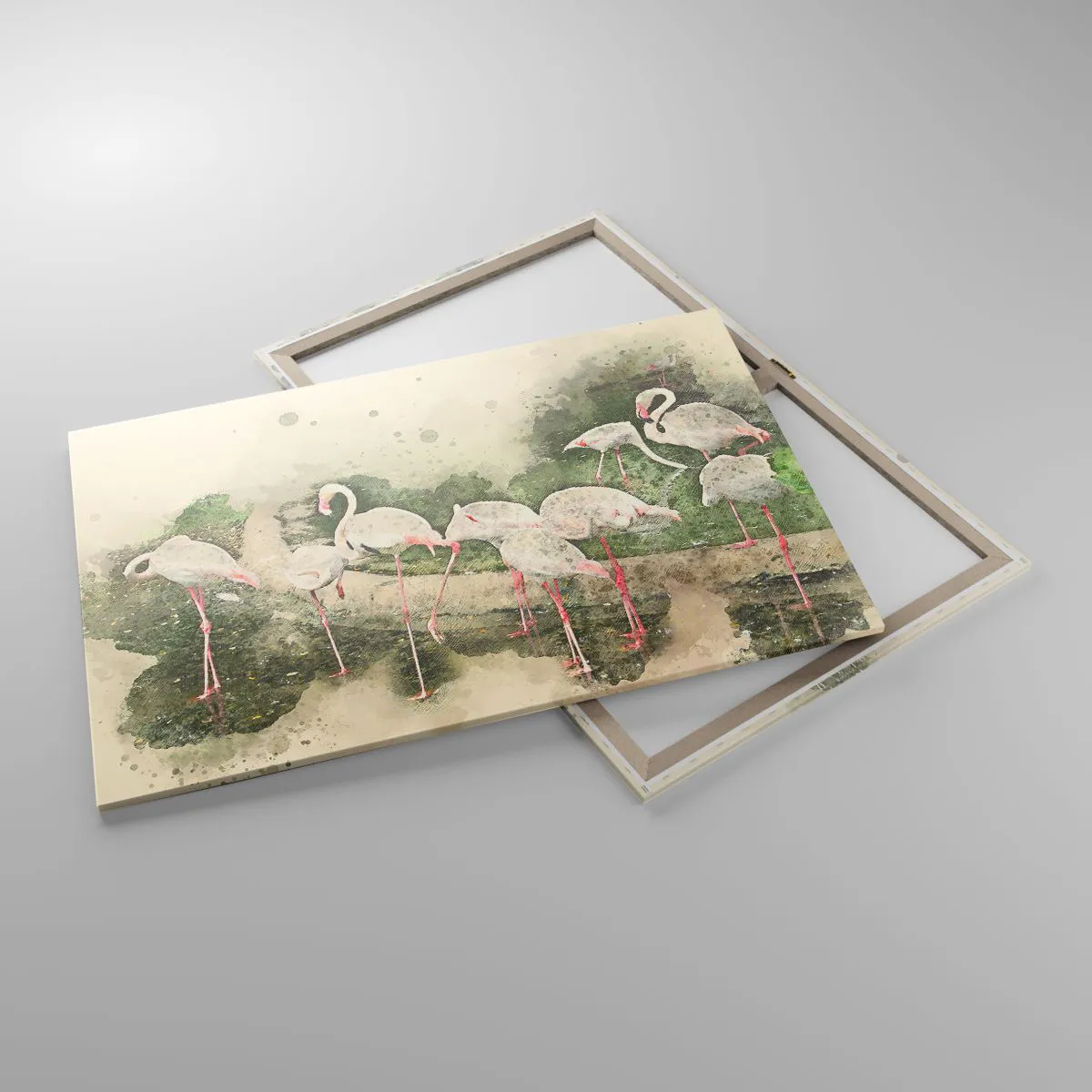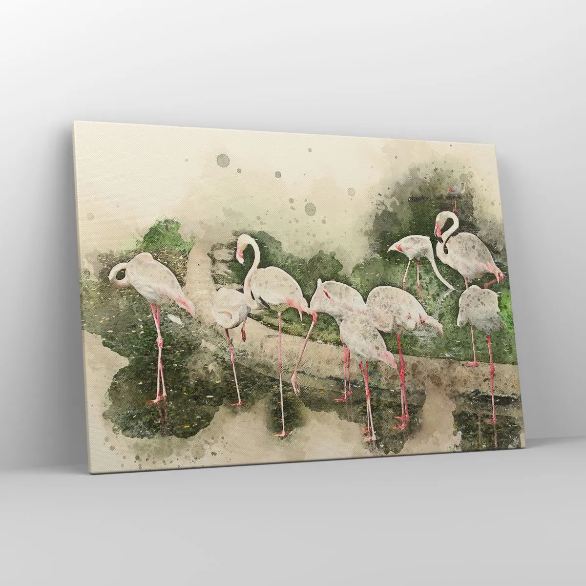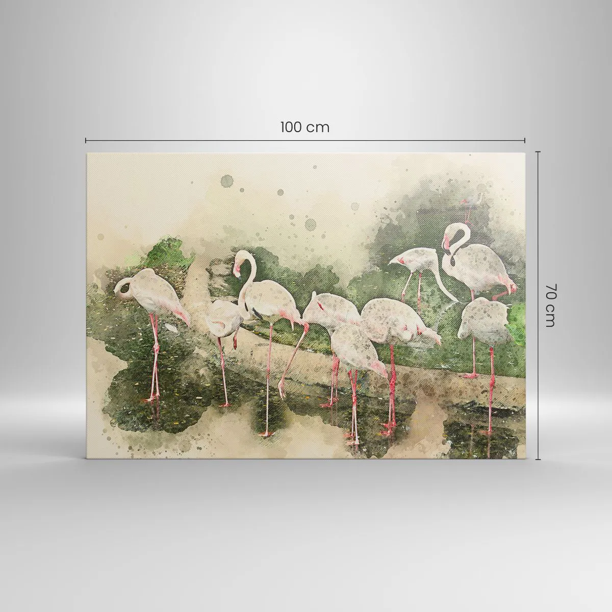 Impression sur toile - Image sur toile - Flamants roses dans leur environnement naturel dans un style aquarelle - 100x70cm - Rêve exotique - Décoration murale moderne pour le salon et la chambre ARTTOR