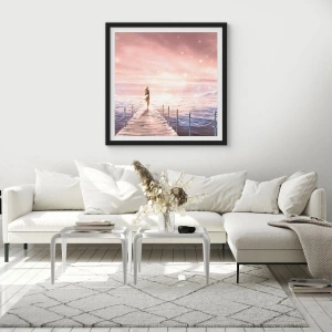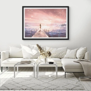 Affiche dans un cadre noir - Poster - Une femme sur une jetée dans un décor de coucher de soleil magique - 70x50cm - A la lumière d'un rêve - Décoration murale moderne pour le salon et la chambre ARTTOR