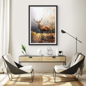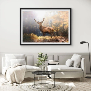 Affiche dans un cadre noir - Poster - Cerf dans la forêt d'automne avec les rayons du soleil - 70x50cm - Toute sa majesté - Décoration murale moderne pour le salon et la chambre ARTTOR