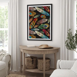 Affiche dans un cadre noir - Poster - Plumes colorées sur fond noir - 70x50cm - Le carnaval des oiseaux - Décoration murale moderne pour le salon et la chambre ARTTOR