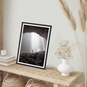 Affiche dans un cadre noir - Poster - Une figure dans une grotte éclairée par des rayons de lumière - 50x70cm - Grotte lumineuse - Décoration murale moderne pour le salon et la chambre ARTTOR