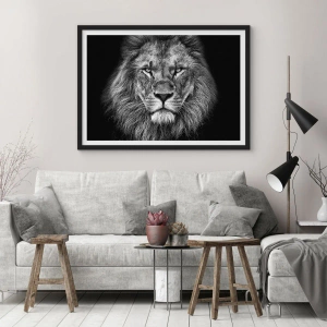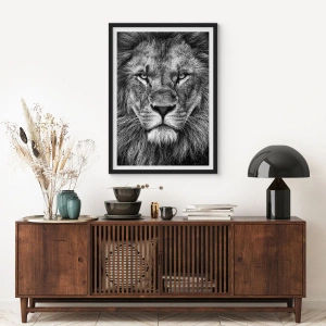 - L'affiche « Lion Majestueux » présente le portrait en noir et blanc d'un lion au regard intense, illustrant la puissance et la beauté de la nature. Un élément décoratif idéal pour les amateurs d'élégance. Elle est fournie avec un cadre noir.