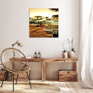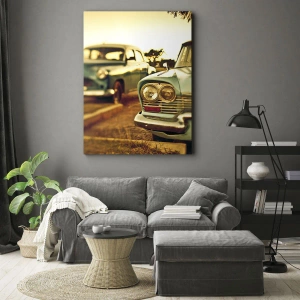- Ce tableau représente des voitures classiques illuminées par la douce lumière d'un coucher de soleil. Parfait pour les intérieurs rétro et les nostalgiques.