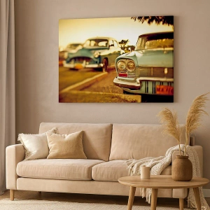 Impression sur toile - Image sur toile - Voitures classiques dans la chaude lumière du coucher du soleil - 120x50cm - Nous attendrons et verrons - Décoration murale moderne pour le salon et la chambre ARTTOR