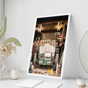 Affiche - Poster - Une voiture ancienne dans un garage entourée d'outils - 50x70cm - Retour vers le passé - Décoration murale moderne pour le salon et la chambre ARTTOR