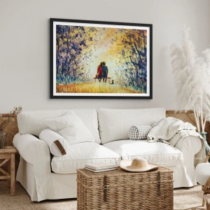 Affiche dans un cadre noir - Poster - Un couple assis sur un banc parmi les arbres d'automne au soleil - 100x70cm - Moment magique - Décoration murale moderne pour le salon et la chambre ARTTOR