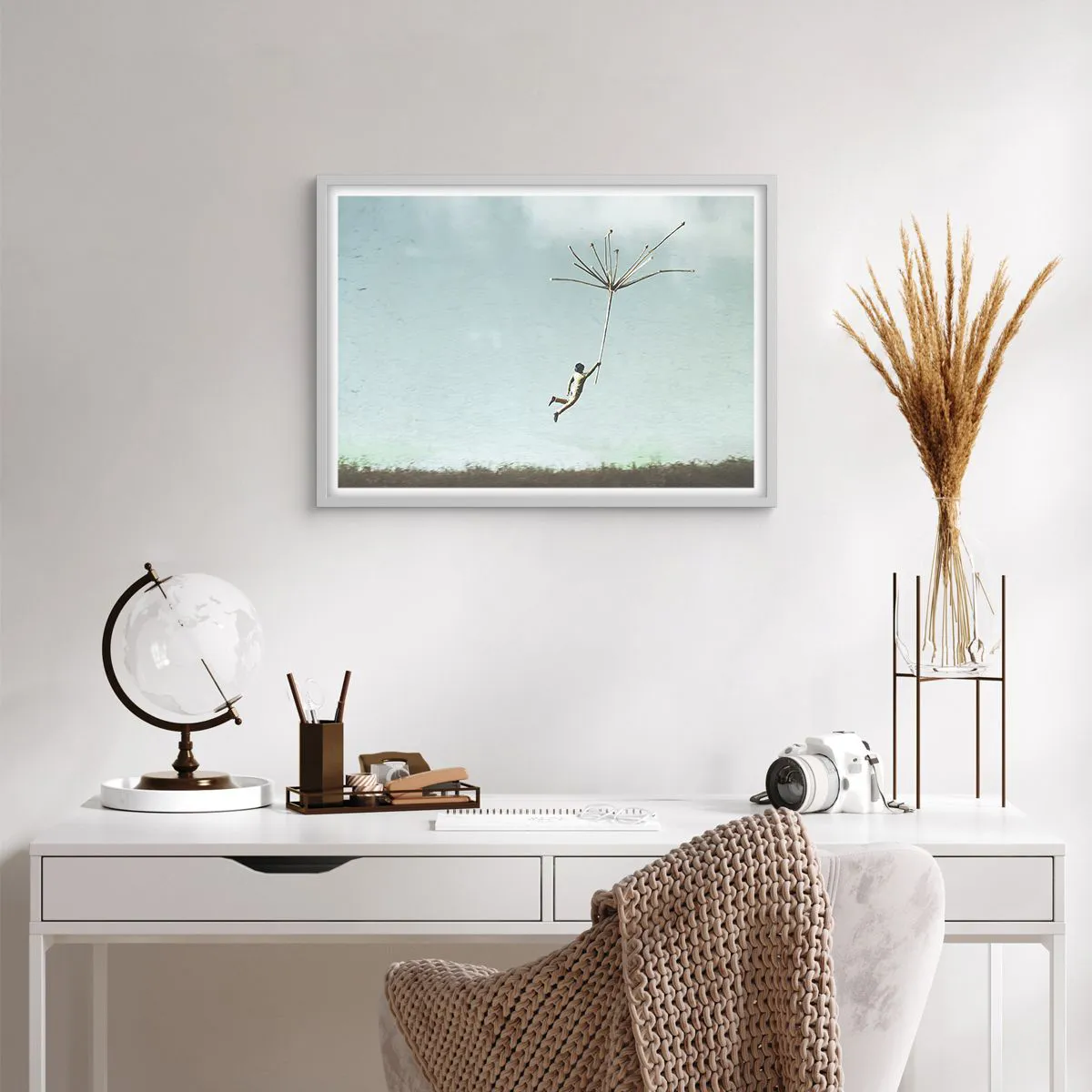 Affiche dans un cadre blanc - Poster - Cerfs-volants, pissenlits, vent - 70x50 cm